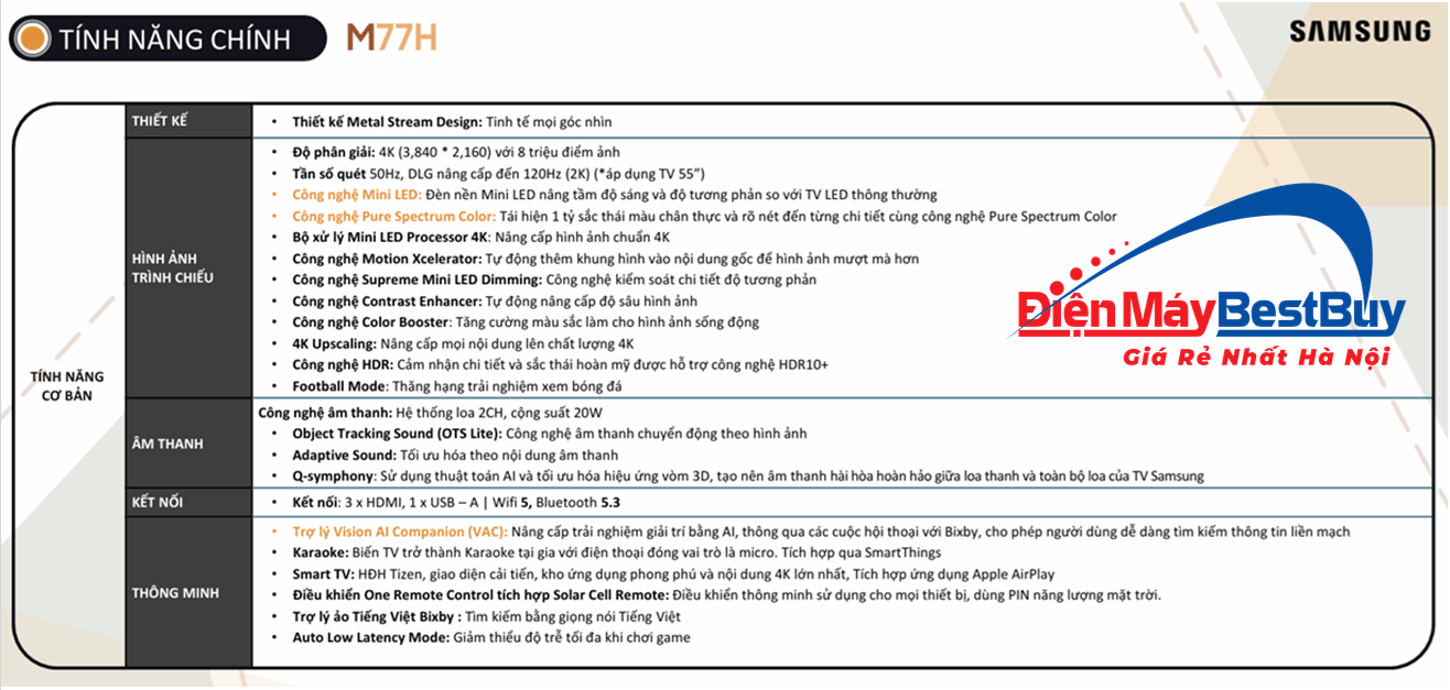 Thông số kỹ thuật Smart Tivi MiniLED Samsung Vision AI 4K 85 inch UA85M77HAKXXV