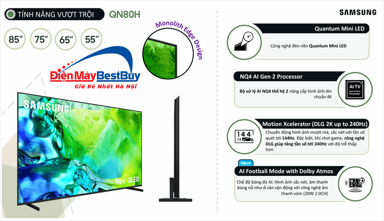 Điện máy BESTBUYS là địa chỉ cung cấp tivi Samsung Neo QLED 4K 55 inch QA55QN80H chính hãng với cam kết: sản phẩm tem mác đầy đủ, giá thành rẻ nhất thị trường, bảo hành 24 tháng. Đội ngũ tư vấn viên của BESTBUYS luôn sẵn sàng tư vấn, hỗ trợ khách hàng 24/7.