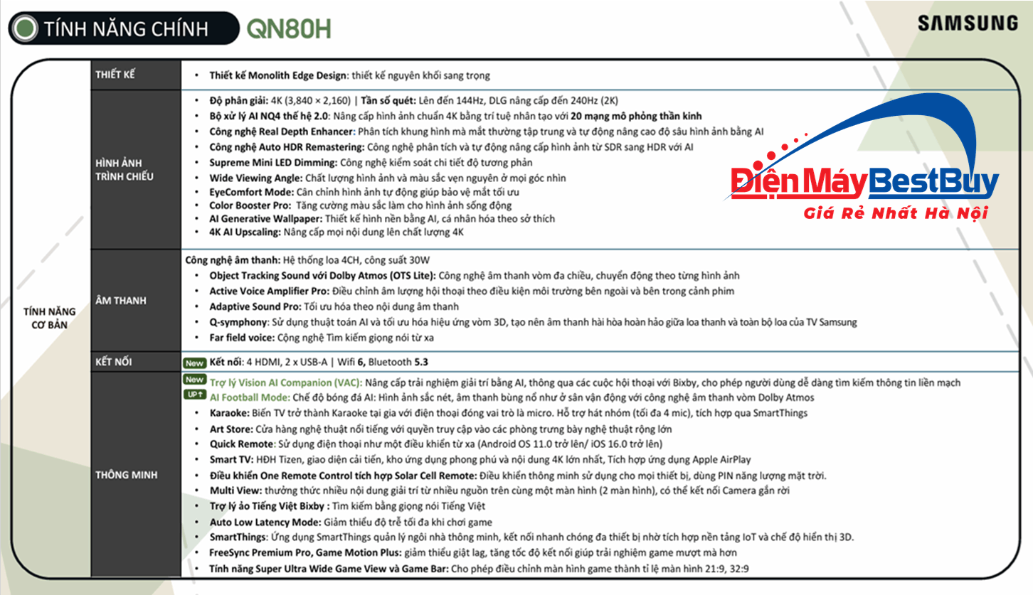 Thông số kỹ thuật Smart Tivi Neo QLED Samsung Vision AI 4K 55 inch QA55QN80HAKXXV