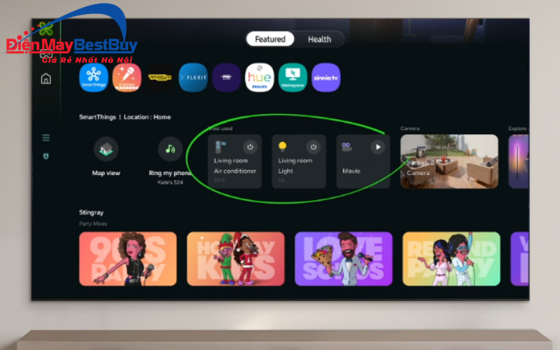 - SmartThings: giúp người dùng kết nối và điều khiển nhiều thiết bị thông minh trong nhà (đèn, điều hòa, robot hút bụi,...) ngay trên màn hình tivi.