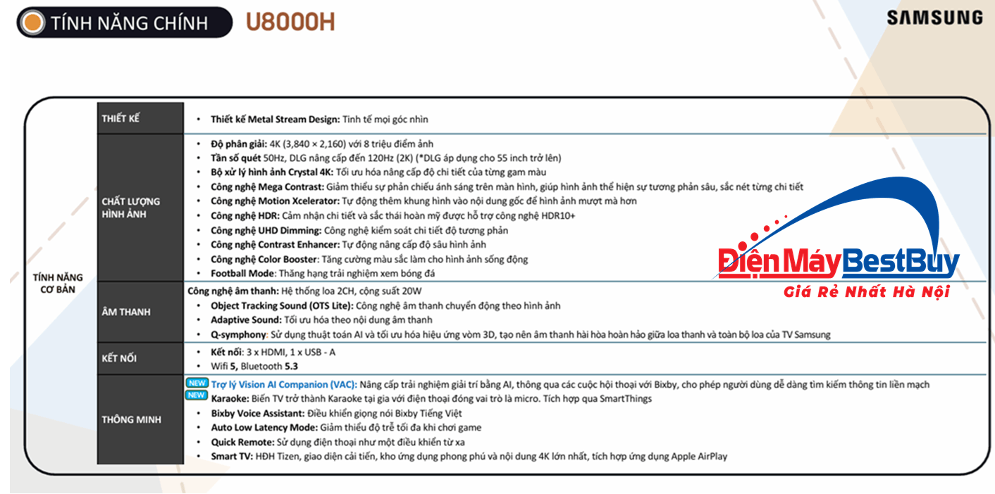 Thông số kỹ thuật Smart Tivi UHD Samsung Vision AI 4K 65 inch UA65U8000HKXXV