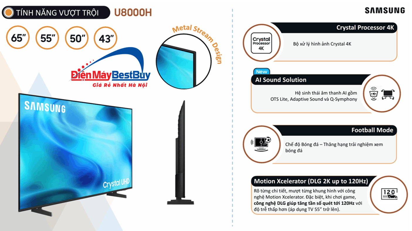 Công nghệ xử lí hình ảnh: Mega Contrast, Motion Xcelerator, HDR, UHD Dimming, Contrast Enhancer, 4K AI Upscaling, Color Booster, Football Mode