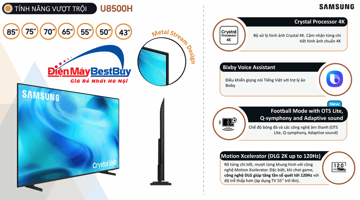 Smart Tivi Samsung UHD 4K 65 inch UA65U8500H Mới 2026 là dòng tivi màn hình lớn được Samsung phát triển nhằm mang đến trải nghiệm giải trí cao cấp cho gia đình hiện đại. Với kích thước 65 inch ấn tượng, độ phân giải 4K sắc nét cùng nhiều công nghệ xử lý hình ảnh và âm thanh tiên tiến, sản phẩm giúp người dùng tận hưởng các chương trình giải trí, phim ảnh hay thể thao một cách sống động như tại rạp. Bên cạnh đó, thiết kế sang trọng cùng các tính năng thông minh cũng khiến mẫu tivi này trở thành lựa chọn đáng cân nhắc cho nhiều không gian sống.
