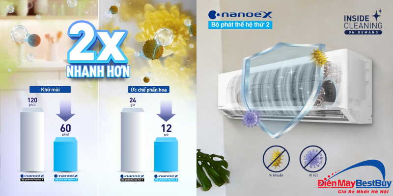 Trong khi đó, điều hòa Panasonic XU18BKH-8 trang bị bộ phát nanoe X thế hệ 3 có khả năng ức chế các chất ô nhiễm, hạn chế nấm mốc và khử mùi hôi với tốc độ nhanh hơn 4 lần so với bộ phát nanoe X thế hệ 2.