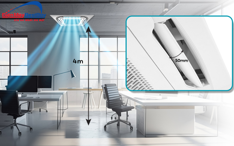 - Chiều cao cấp khí lên tới 4m - rất phù hợp với các văn phòng có trần cao, khu vực sảnh, phòng họp lớn hoặc không gian thiết kế mở. Đây là lợi thế rõ rệt vì nhiều dòng điều hòa thông thường sẽ bị giảm hiệu quả khi lắp ở không gian có độ cao lớn. Với điều hòa âm trần Casper, luồng gió vẫn đủ mạnh để đưa hơi lạnh xuống khu vực làm việc của người dùng, bảo đảm cảm giác mát rõ rệt mà không cần hạ nhiệt độ quá thấp.