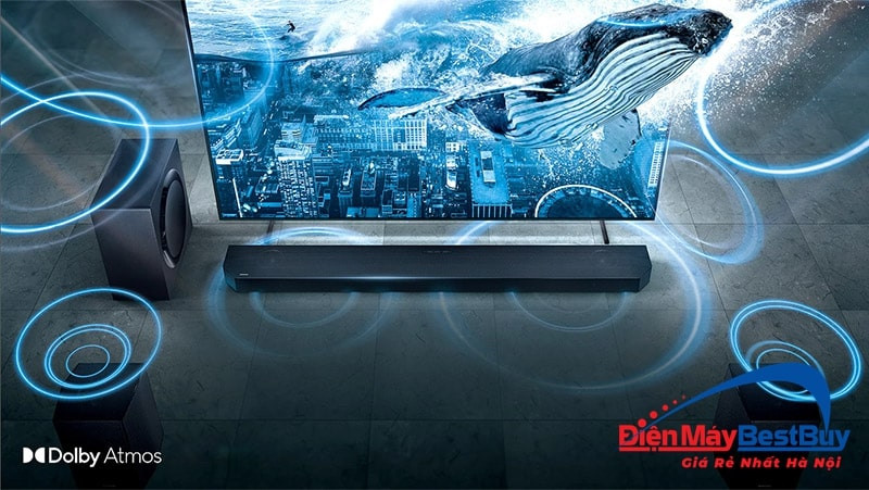 Tivi Samsung hỗ trợ âm thanh vòm 3D Dolby Atmos, tạo ra hiệu ứng âm thanh đa chiều lan tỏa khắp không gian, khiến bạn cảm thấy như đang ở trong cảnh phim. Công nghệ Object Tracking Sound (OTS) hoặc OTS Lite khiến âm thanh di chuyển theo hành động trên màn hình, tăng cường độ sống động và tính chân thực của nội dung.