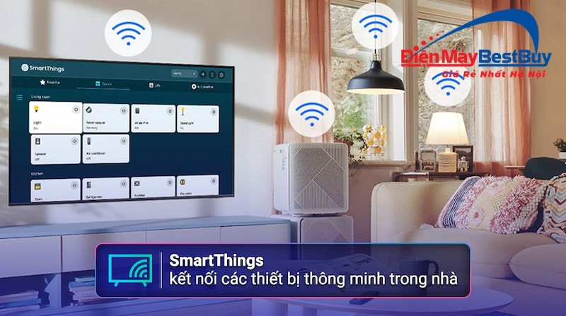 Tivi đóng vai trò trung tâm điều khiển nhà thông minh nhờ tích hợp Built-in IoT Hub, cho phép kết nối và quản lý các thiết bị IoT mà không cần thiết bị phụ trợ. Thông qua ứng dụng SmartThings trên điện thoại, bạn có thể dễ dàng điều khiển tivi và quản lý toàn bộ hệ sinh thái thông minh trong ngôi nhà của mình.