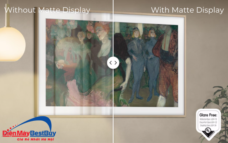 - Matte Display: Tấm nền chống phản sáng của tivi The Frame giúp giảm thiểu hiện tượng phản chiếu ánh sáng từ môi trường xung quanh, giúp người dùng có trải nghiệm hình ảnh tốt hơn trong mọi điều kiện ánh sáng.