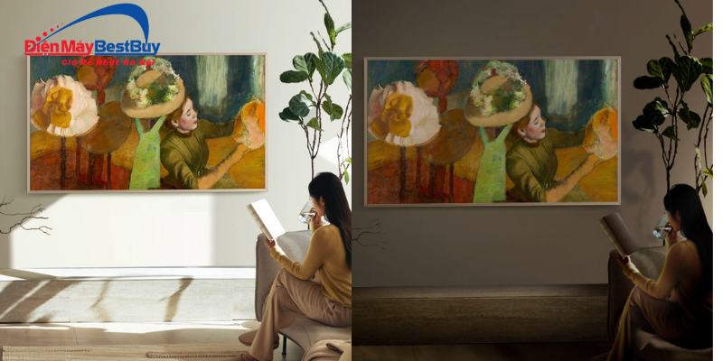 Khi tắt chế độ xem thông thường và chọn chế độ Art Mode, màn hình không chuyển sang màu đen như TV truyền thống mà sẽ hiển thị các tác phẩm nghệ thuật, hình ảnh trang trí hoặc ảnh cá nhân theo phong cách khung tranh thực thụ. Tính năng này không chỉ tăng giá trị thẩm mỹ mà còn giúp chiếc TV trở thành một phần của nội thất, thay vì tạo cảm giác “màn hình đen” chiếm diện tích khi không sử dụng.