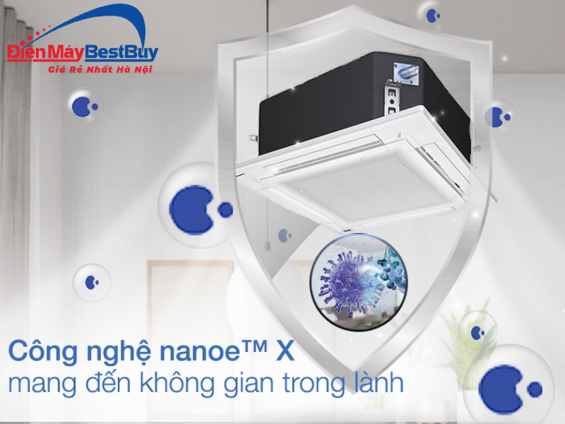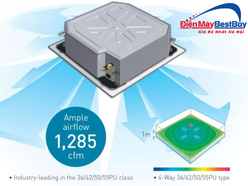 Thiết kế cassette 4 hướng gió giúp luồng không khí lan tỏa đều khắp căn phòng, tạo cảm giác mát dễ chịu. Máy cũng được trang bị công nghệ Inverter giúp tối ưu hiệu suất vận hành và giảm tiêu thụ điện năng.
