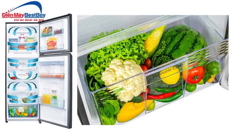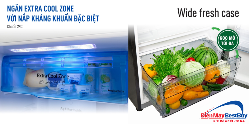 Ngoài ra, mẫu tủ lạnh này cũng được trang bị ngăn rau quả Wide Fresh Case, ngăn mát Extra Cool Zone cùng công nghệ cốt lõi như inverter và cảm biến ECONAVI giúp tiết kiệm năng lượng hiệu quả.