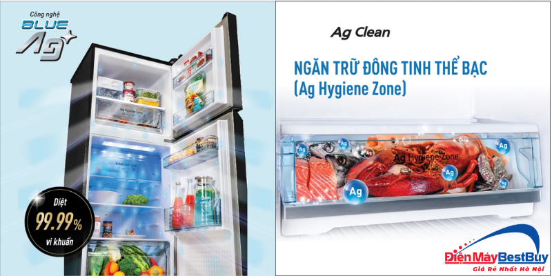 Về khả năng kháng khuẩn và khử mùi, tủ lạnh được trang bị đồng thời các công nghệ Ag Clean, ngăn tinh thể bạc Ag Hygiene Zone và Blue Ag+ giúp loại bỏ vi khuẩn, hạn chế lẫn mùi chéo và giữ cho không khí bên trong tủ luôn sạch sẽ, góp phần bảo quản thực phẩm tươi ngon lâu hơn.