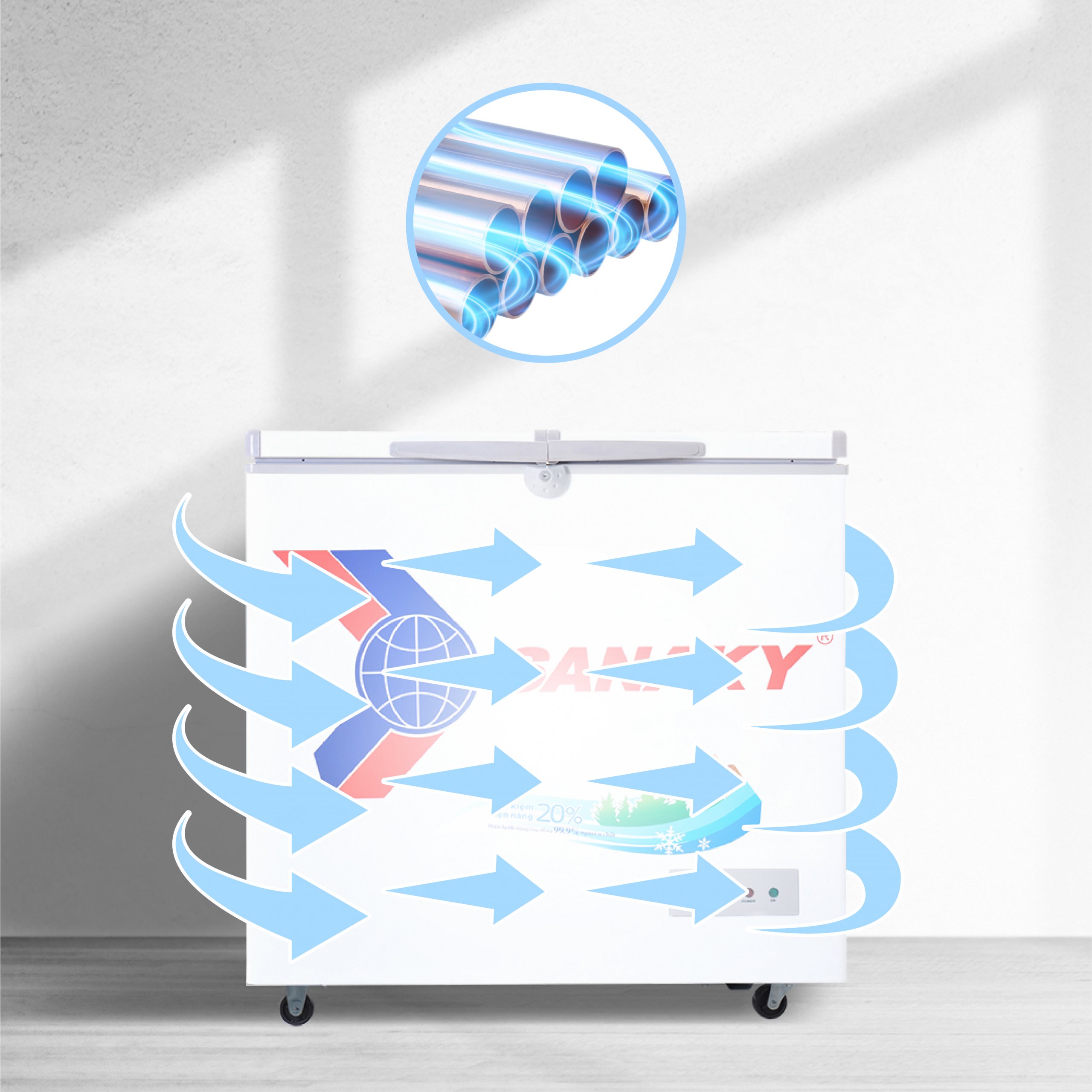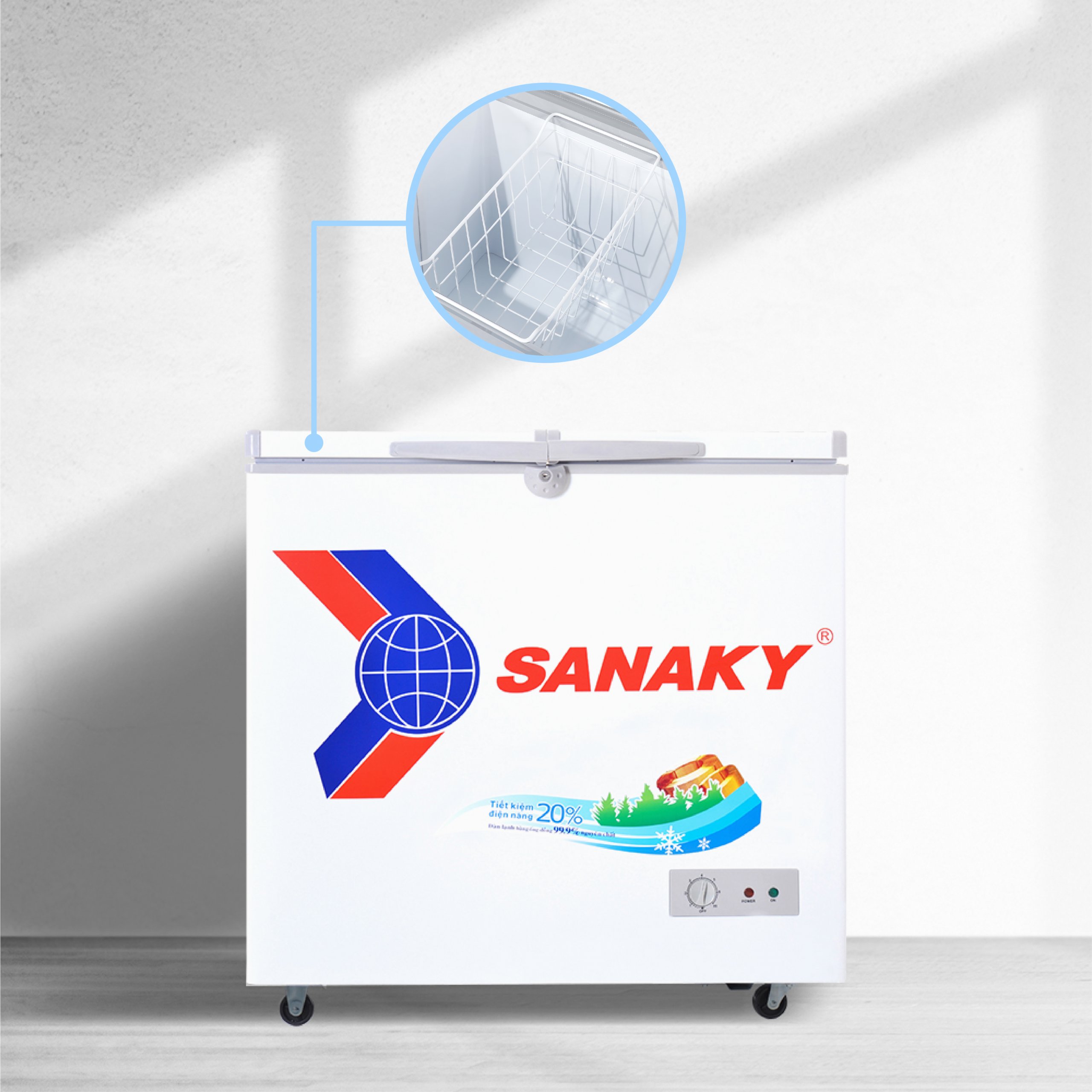 Tủ đông Sanaky VH 2599A1 là có giàn lạnh bằng đồng giúp làm lạnh nhanh và sâu hơn, giúp bảo quản kem, thịt, cá, thực phẩm đông lạnh,...