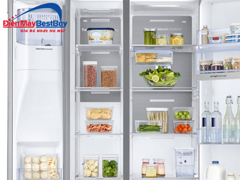 Ngăn đông rộng rãi giúp bảo quản thịt cá, hải sản và các loại thực phẩm đông lạnh trong thời gian dài. Nhờ thiết kế Side By Side, thực phẩm trong ngăn đông được sắp xếp gọn gàng, hạn chế tình trạng xếp chồng lên nhau, giúp người dùng dễ dàng tìm kiếm và lấy thực phẩm khi cần. Các khay chứa ở cánh cửa tủ cũng được tận dụng tối đa để đựng chai nước, hộp sữa, gia vị, góp phần tối ưu không gian lưu trữ tổng thể.