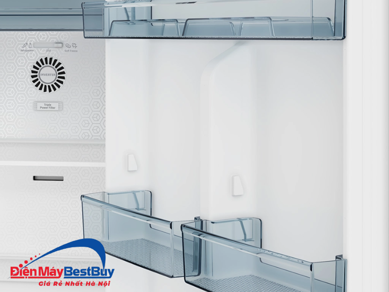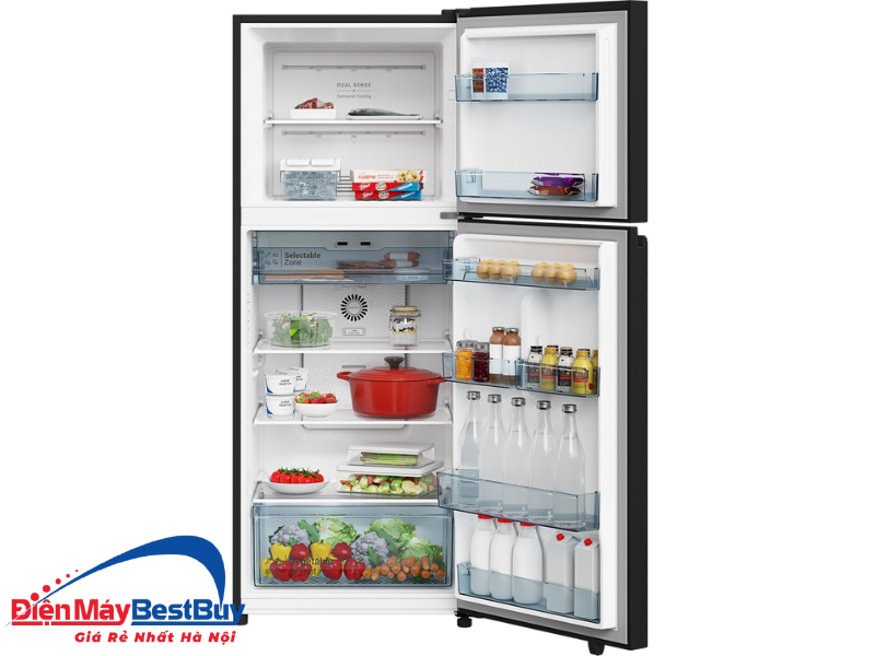 Không gian bên trong được bố trí khoa học, chia thành nhiều ngăn riêng biệt giúp phân loại thực phẩm dễ dàng. Ngăn lạnh rộng rãi thuận tiện bảo quản rau củ, trái cây, thực phẩm tươi sống và đồ uống, trong khi ngăn đông có sức chứa lớn phù hợp để trữ thịt cá, hải sản và thực phẩm đông lạnh dài ngày.