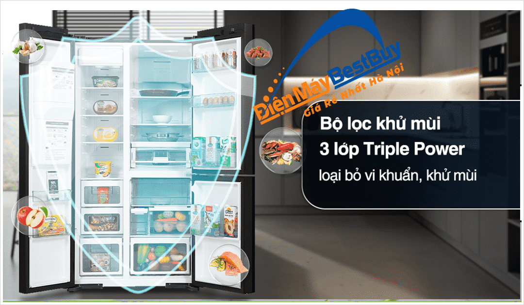 Tủ lạnh được tích hợp bộ lọc 3 lớp Triple Power Filter, có khả năng loại bỏ 99.99% vi khuẩn, nấm mốc và mùi khó chịu như hành, cá, thịt sống...