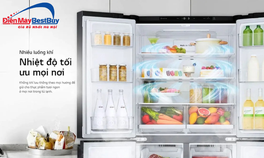 Hệ thống Multi Air Flow giúp phân bổ khí lạnh đều đến mọi ngăn tủ, đảm bảo thực phẩm ở góc sâu hay cạnh cửa đều nhận được lượng hơi lạnh tối ưu. Công nghệ này đặc biệt hữu ích khi người dùng có thói quen mở tủ thường xuyên hoặc đặt nhiều đồ bên trong. Multi Air Flow duy trì sự ổn định của nhiệt độ và giúp thực phẩm tươi lâu hơn.
