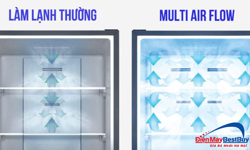 Hệ thống Multi Air Flow giúp hơi lạnh lan tỏa đồng đều đến mọi ngóc ngách trong tủ. Dù bạn để thực phẩm ở vị trí nào, khí lạnh vẫn luôn bao phủ và duy trì độ tươi tối ưu. Công nghệ này đặc biệt hữu ích khi trữ nhiều thực phẩm hoặc mở tủ nhiều lần trong ngày.