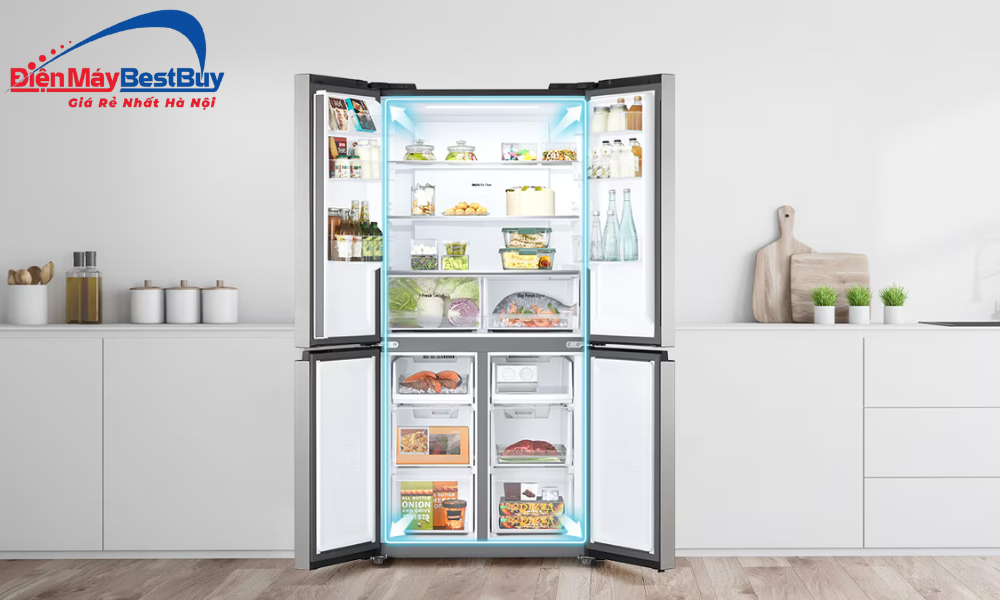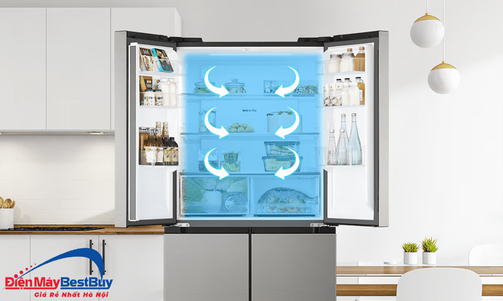 Công nghệ Multi Air Flow giúp luồng khí lạnh được phân bổ đều khắp các ngăn tủ thông qua hệ thống cửa gió thông minh. Nhờ đó, nhiệt độ bên trong luôn ổn định, thực phẩm được làm lạnh nhanh và đồng đều dù đặt ở bất kỳ vị trí nào.