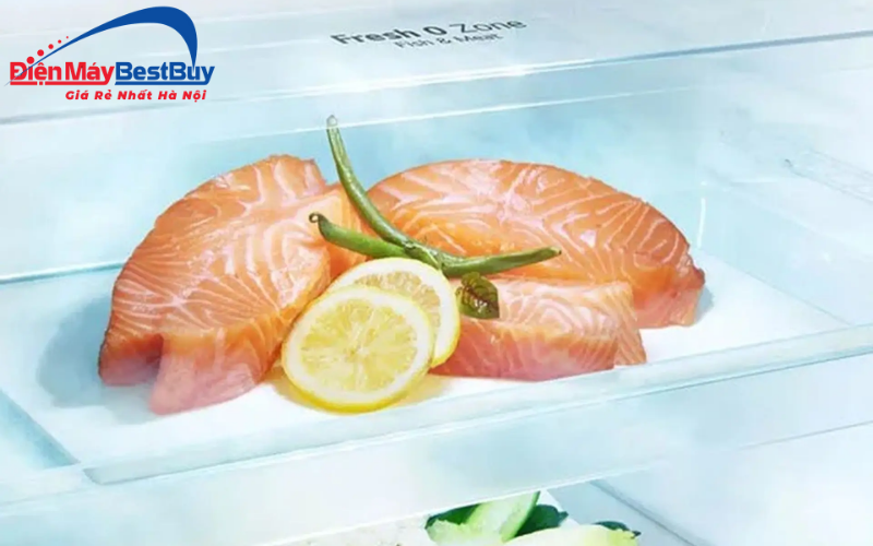 Ngăn Fresh 0 Zone giúp bảo quản thịt, cá và thực phẩm tươi sống ở mức nhiệt gần 0 độ C. Thực phẩm được giữ tươi mà không bị đông cứng, giúp người dùng tiết kiệm thời gian rã đông và chế biến nhanh chóng hơn.