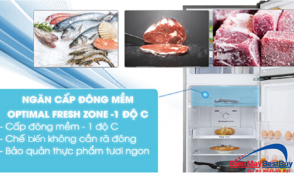 Khay kính chịu lực có thể tháo lắp linh hoạt, hỗ trợ tối ưu không gian khi cần bảo quản nồi lớn hoặc hộp trữ đông dung tích cao. Bên cạnh đó, phần cửa tủ có nhiều ngăn nhỏ giúp trữ chai lọ, gia vị hoặc các loại đồ uống tiện lợi và dễ lấy. Ngăn rau củ Fresh Zone được thiết kế rộng rãi và kín, hỗ trợ duy trì độ ẩm tốt hơn, giúp rau quả giữ được độ tươi lâu hơn.