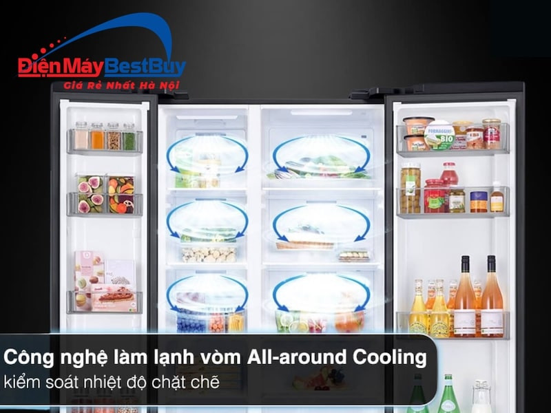 Khí lạnh được phân bổ đồng đều đến mọi ngóc ngách nhờ công nghệ All-Around Cooling. Hệ thống này liên tục giám sát và luân chuyển hơi lạnh qua các lỗ khí được bố trí chiến lược. Điều này đảm bảo một môi trường nhiệt độ và độ ẩm đồng nhất khắp RS57DG400EM9SV. Kết quả là thực phẩm được bảo quản tươi ngon lâu hơn, dù ở bất kỳ vị trí nào.