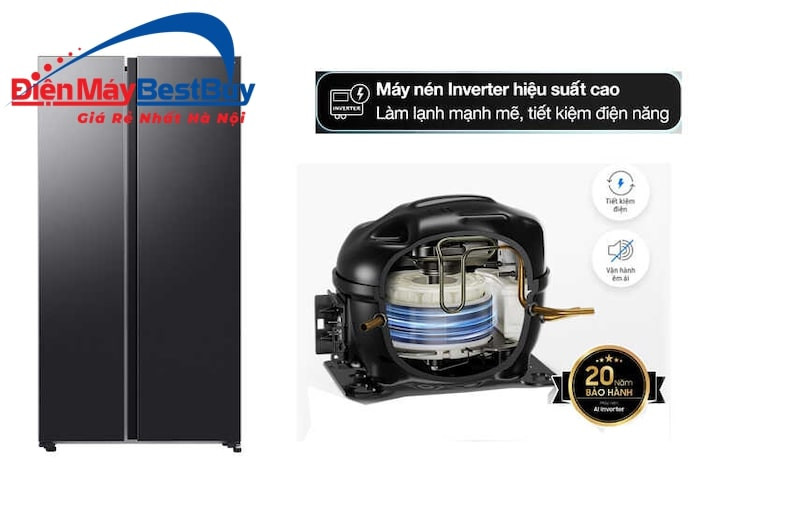 Tủ lạnh sử dụng máy nén AI Inverter với cấu trúc cải tiến, tăng quán tính 4.1 lần. Công nghệ này tự động điều chỉnh tốc độ vận hành dựa trên nhu cầu sử dụng thực tế. Điều này giúp tủ tiêu thụ ít điện năng hơn, vận hành êm ái và giảm tiếng ồn. Samsung khẳng định độ bền bỉ vượt trội với chính sách bảo hành 20 năm cho máy nén.