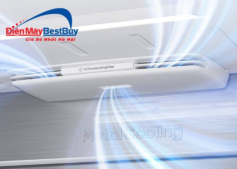 Tấm kim loại cao cấp Metal Cooling ở mặt lưng tủ hoạt động như một "lá chắn" giữ nhiệt. Nó giúp duy trì nhiệt độ bên trong tủ luôn ổn định, ngay cả khi bạn thường xuyên mở cửa. Công nghệ này hỗ trợ khôi phục nhiệt độ về mức cài đặt một cách nhanh chóng. Bằng cách hạn chế thất thoát hơi lạnh, thực phẩm được bảo quản tối ưu.