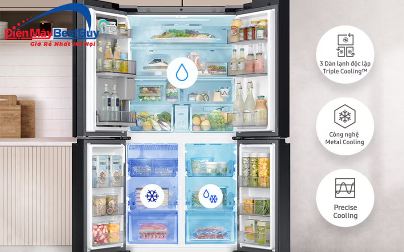 Không chỉ vậy, Triple Cooling còn hạn chế tình trạng lẫn mùi giữa các ngăn, đảm bảo rau củ, thịt cá và thực phẩm đông lạnh luôn giữ được hương vị nguyên bản.