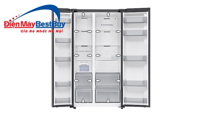 Samsung RS70F65Q3TSV được trang bị công nghệ làm lạnh All-around Cooling giúp kiểm soát nhiệt độ một cách chính xác và đồng đều ở mọi ngóc ngách bên trong tủ. Hệ thống này liên tục theo dõi sự thay đổi nhiệt độ và phân phối luồng khí lạnh đều khắp các ngăn, giúp thực phẩm luôn được bảo quản trong điều kiện lý tưởng.