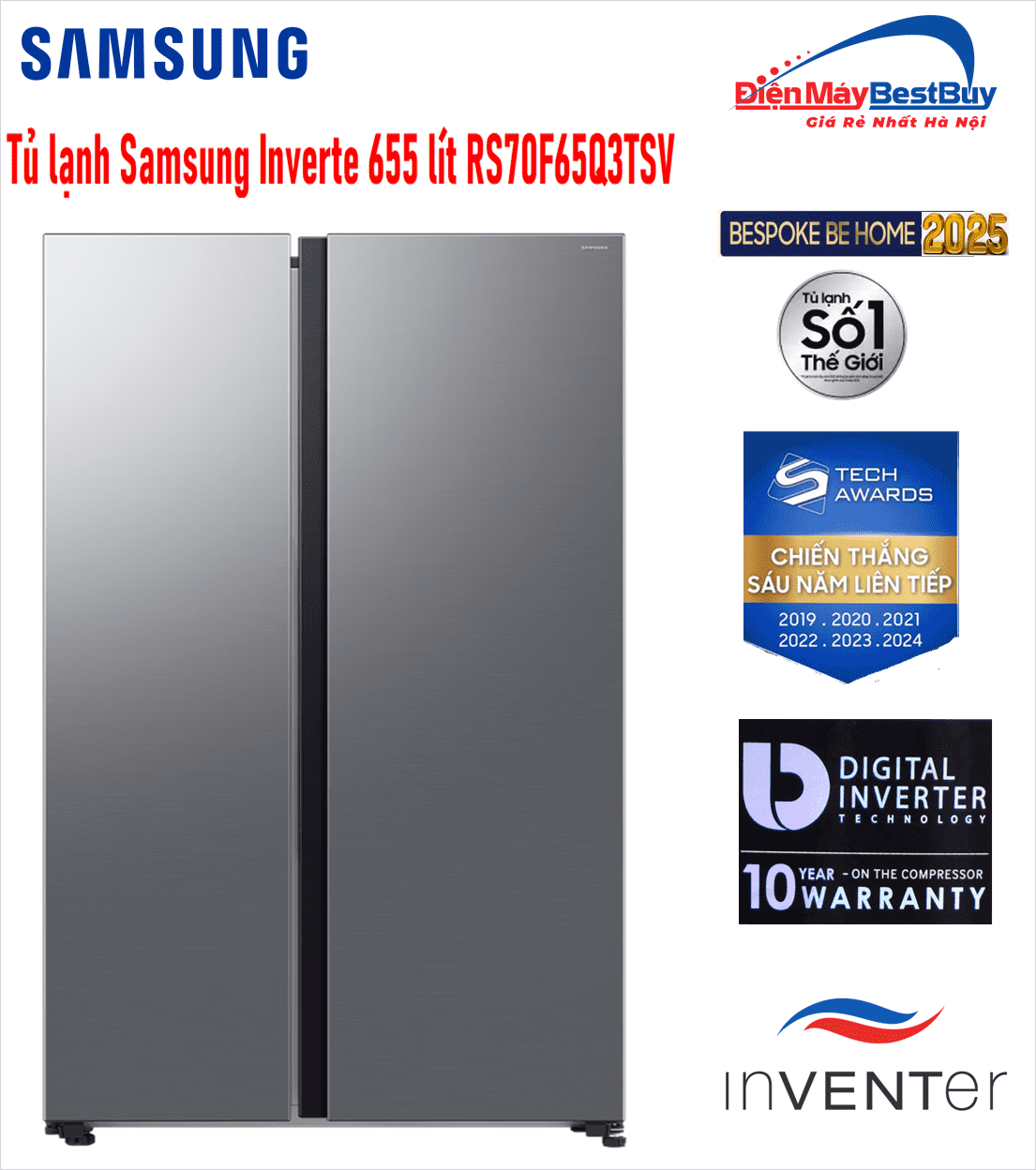Tủ lạnh Samsung RS70F65Q3TSV Inverter Side By Side 655 lít là lựa chọn lý tưởng cho các gia đình đông thành viên hoặc những không gian bếp hiện đại yêu cầu cao về thẩm mỹ, dung tích và khả năng bảo quản thực phẩm. Sản phẩm không chỉ gây ấn tượng bởi thiết kế sang trọng mà còn được trang bị hàng loạt công nghệ tiên tiến giúp tiết kiệm điện, vận hành êm ái và giữ thực phẩm luôn tươi ngon trong thời gian dài.