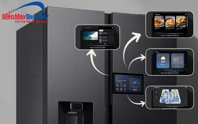 Người dùng có thể theo dõi nhiệt độ, điều chỉnh chế độ làm lạnh, xem lịch trình/gợi ý công thức nấu ăn hoặc quản lý các thiết bị thông minh khác trong hệ sinh thái Samsung. Khi kết hợp với trợ lý giọng nói Bixby, người dùng có thể ra lệnh bằng giọng nói để điều khiển tủ lạnh mà không cần chạm tay, rất tiện lợi khi đang nấu ăn hoặc tay đang bận rộn.