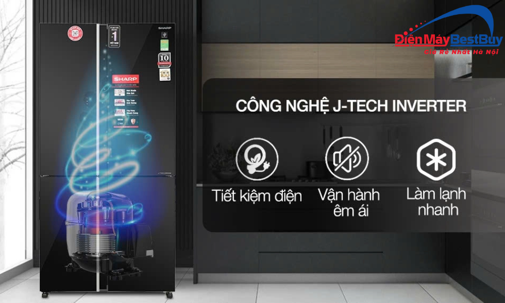 Công nghệ J-Tech Inverter là một trong những điểm mạnh nổi bật trên tủ lạnh Sharp SJ-FX650V-MK. Công nghệ này cho phép máy nén điều chỉnh công suất linh hoạt theo nhu cầu làm lạnh thực tế, giúp tối ưu hiệu suất hoạt động và giảm tiêu thụ điện năng đáng kể.