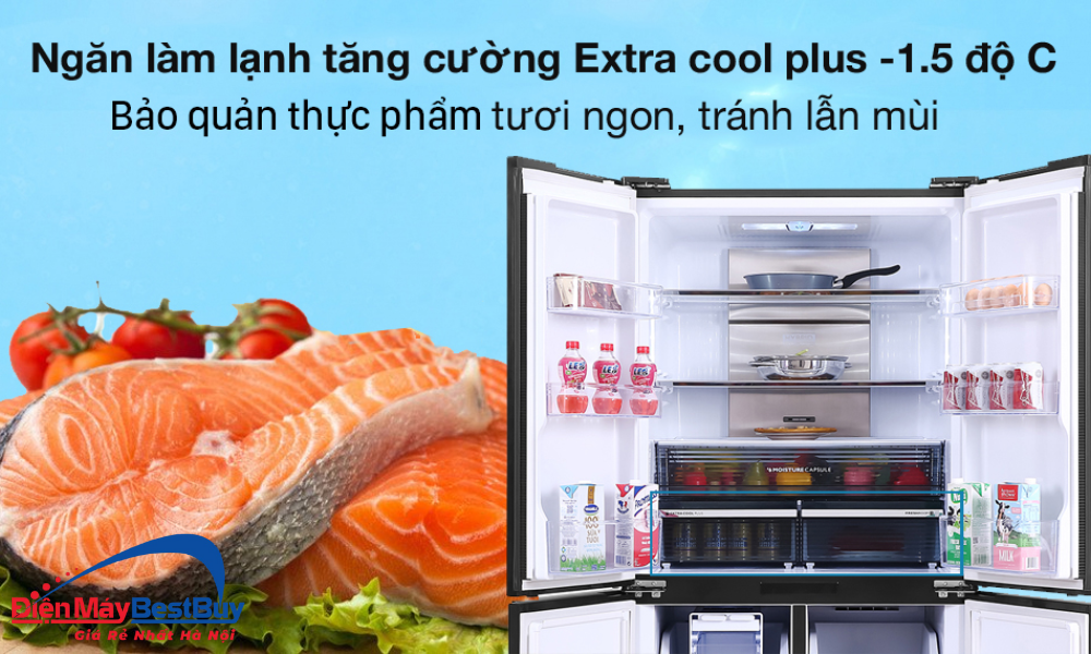 Ngăn Extra Cool Plus là khu vực làm lạnh tăng cường, thích hợp để bảo quản thịt tươi, cá, đồ uống hoặc các loại thực phẩm cần nhiệt độ thấp hơn ngăn mát thông thường. Nhiệt độ trong ngăn luôn ổn định, giúp thực phẩm giữ trọn độ tươi ngon mà không cần cấp đông.