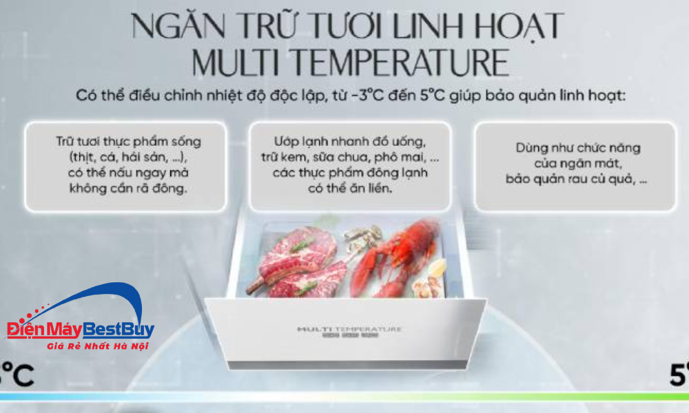 Thiết kế ngăn linh hoạt giúp người dùng chủ động hơn trong việc sắp xếp và bảo quản thực phẩm, đồng thời tiết kiệm thời gian sơ chế khi nấu ăn hằng ngày.
