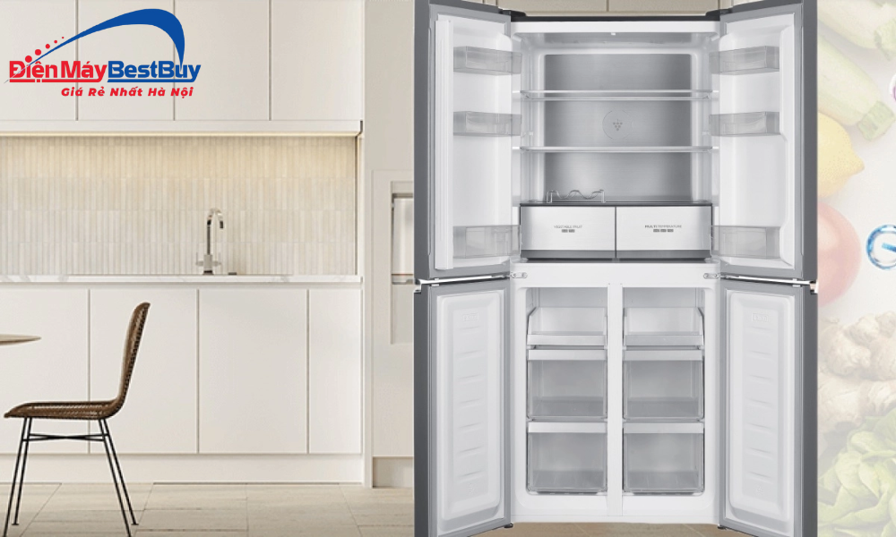 Dung tích lớn giúp gia đình thoải mái dự trữ thực phẩm cho nhiều ngày, đặc biệt phù hợp với những gia đình bận rộn hoặc có thói quen mua sắm theo tuần. Cách bố trí khoa học giúp tận dụng tối đa không gian mà vẫn đảm bảo sự gọn gàng và tiện lợi khi sử dụng.