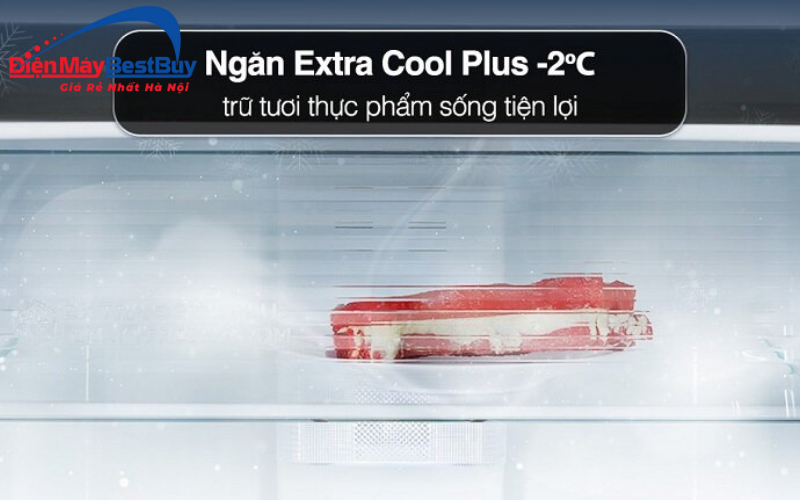 Extra Cool Plus là ngăn làm lạnh đặc biệt, duy trì nhiệt độ trong khoảng -2°C; phù hợp để bảo quản đồ uống, đồ tráng miệng hoặc các món cần làm lạnh nhanh. Bên cạnh đó, Extra Cool Plus còn hỗ trợ giữ độ tươi cho thịt cá trong thời gian ngắn mà không làm đông cứng. Nếu bạn mua thực phẩm về và sẽ chế biến trong ngày, ngăn này giúp giữ trọn vẹn độ tươi ngon mà không phải rã đông như khi để trong ngăn đông.