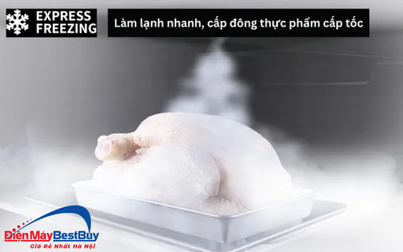 Express Freezing là chế độ làm đông nhanh dành cho những lúc bạn cần cấp đông thực phẩm ngay. Khi kích hoạt, tủ lạnh sẽ tăng cường hoạt động của ngăn đông để thực phẩm đạt trạng thái đông trong thời gian ngắn hơn. Đây là tính năng hữu ích khi bạn muốn cấp đông thịt cá ngay sau khi mua, nhằm giữ được độ tươi và hạn chế vi khuẩn phát triển.