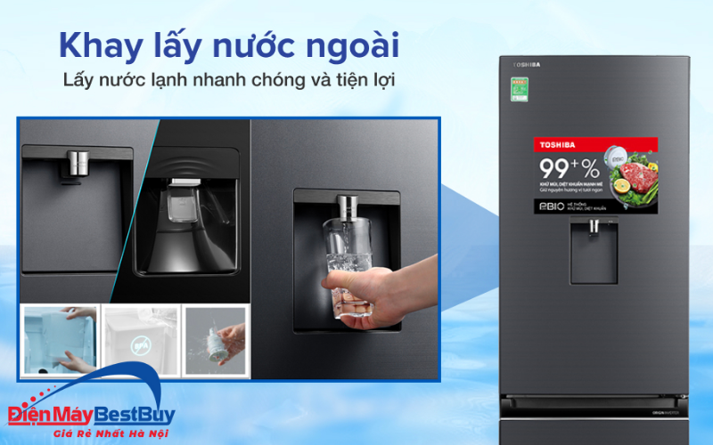- Tính năng lấy nước bên ngoài giúp người dùng nhanh chóng có nước mát mà không cần mở cửa tủ. Tính năng này không chỉ tiện lợi mà còn giúp hạn chế thất thoát hơi lạnh, góp phần tiết kiệm điện năng và giữ nhiệt độ bên trong tủ ổn định hơn.