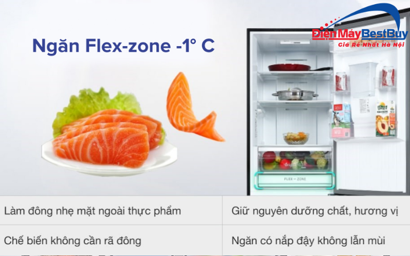 Một điểm cộng đáng chú ý khác là ngăn Flex-Zone với nhiệt độ khoảng -1°C. Đây là mức nhiệt lý tưởng để bảo quản thịt cá tươi trong thời gian ngắn mà không cần đông đá hoàn toàn. Thực phẩm được giữ ở trạng thái mềm, dễ chế biến, đồng thời vẫn đảm bảo độ tươi ngon và dinh dưỡng.