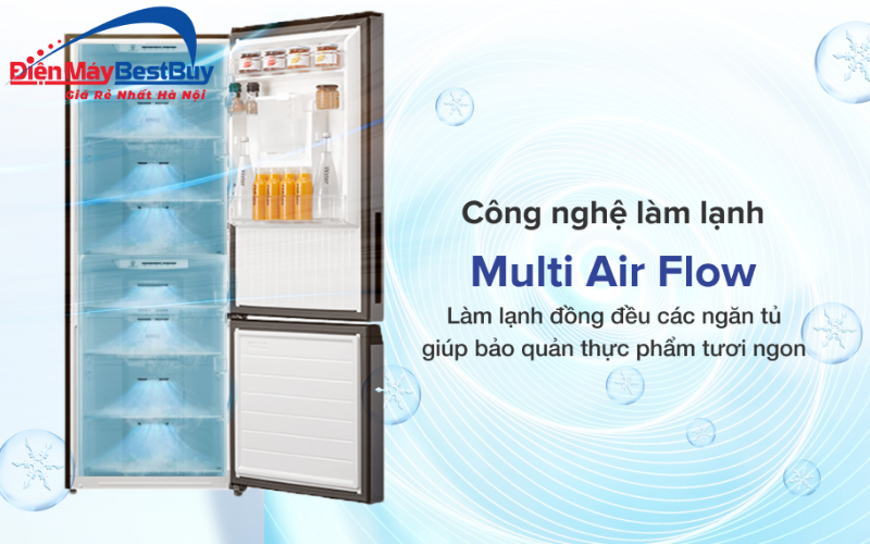 Với công nghệ Multi Air Flow, luồng khí lạnh được phân bổ đều khắp các ngăn trong tủ, giúp nhiệt độ bên trong tủ luôn được duy trì ổn định, thực phẩm ở mọi vị trí đều được làm lạnh đồng đều.