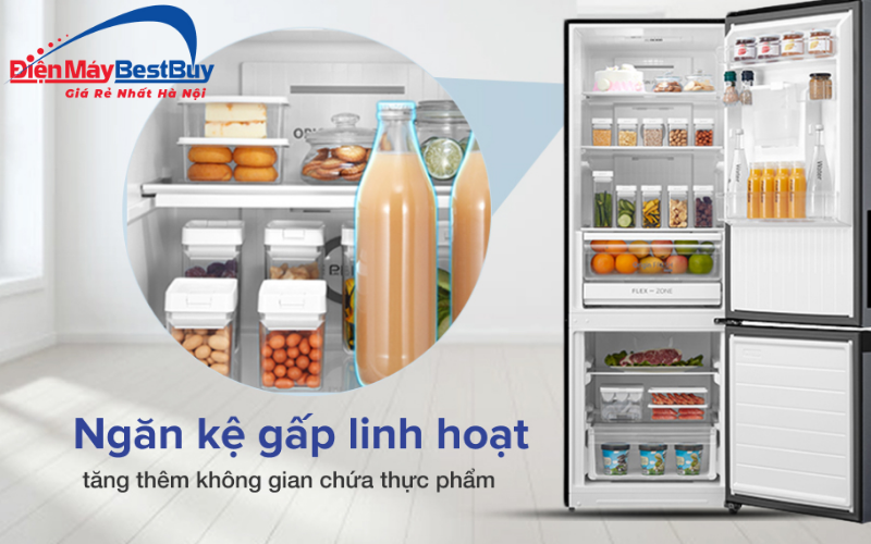 - Ngăn kệ gấp linh hoạt là giải pháp hữu ích khi cần lưu trữ các vật dụng có kích thước lớn như chai lọ cao hoặc hộp thực phẩm cồng kềnh. Người dùng có thể dễ dàng điều chỉnh không gian bên trong tủ theo nhu cầu thực tế.