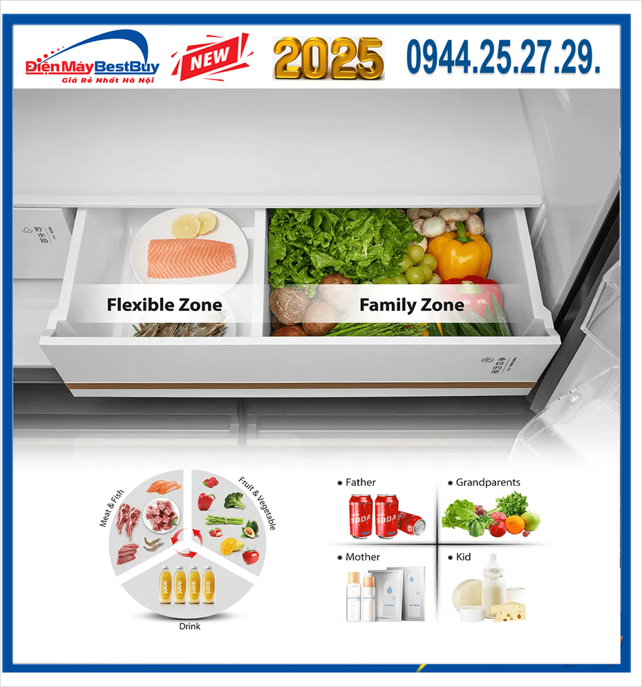 Dung tích lớn kết hợp bố cục thông minh giúp người dùng sắp xếp thực phẩm gọn gàng, dễ tìm kiếm và tối ưu không gian lưu trữ.