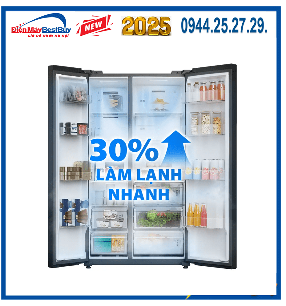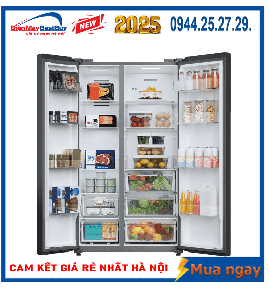 Dung tích lớn kết hợp thiết kế Side by Side giúp việc sắp xếp thực phẩm trở nên gọn gàng, dễ quan sát và thuận tiện khi sử dụng hàng ngày.